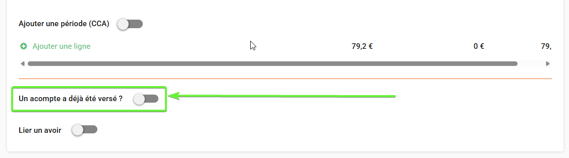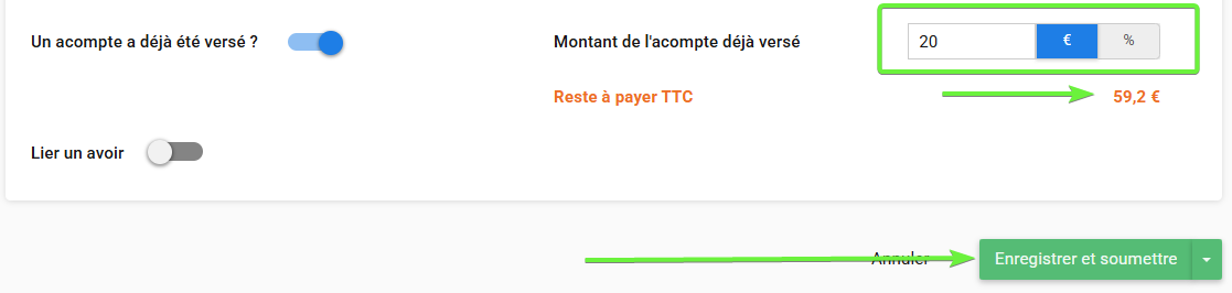 Vous pourrez alors indiquer si un acompte a déjà été versé :
